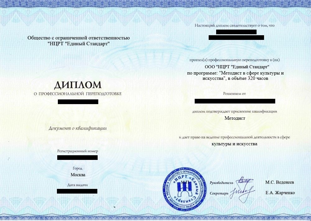 • «Методист в сфере культуры и искусства» с правом ведения профессиональной деятельности в сфере культуры искусства